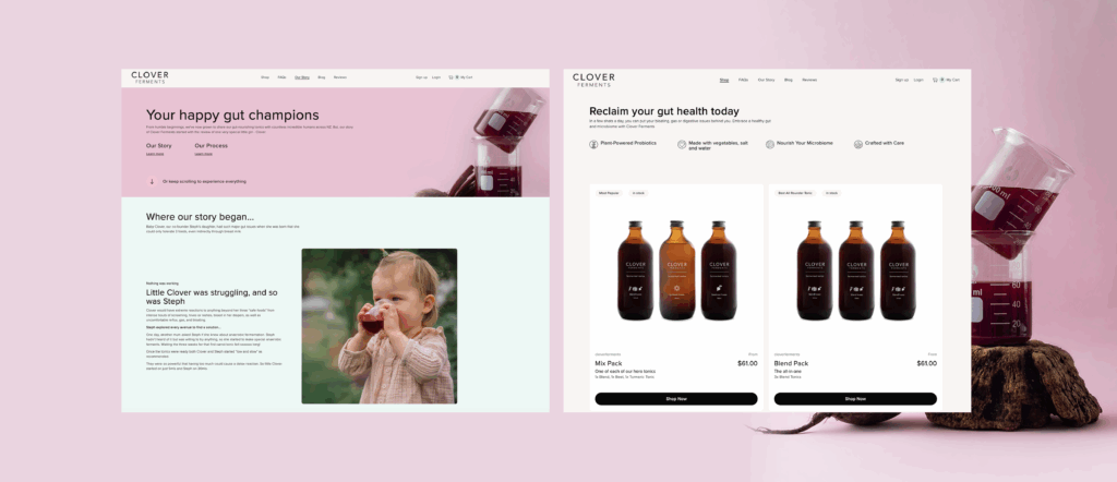 As sales soared to $20k a month, we transitioned the team to a high-performing Shopify website with Klaviyo. While anyone can start a Shopify site using a generic template, standing out and enhancing usability requires an experienced team of web designers. That’s where Backbone comes in. We create custom designs and high-converting websites beyond the basic tools. For Clover Ferments, we guided them through our design process to create a one-of-a-kind website that delivered results.